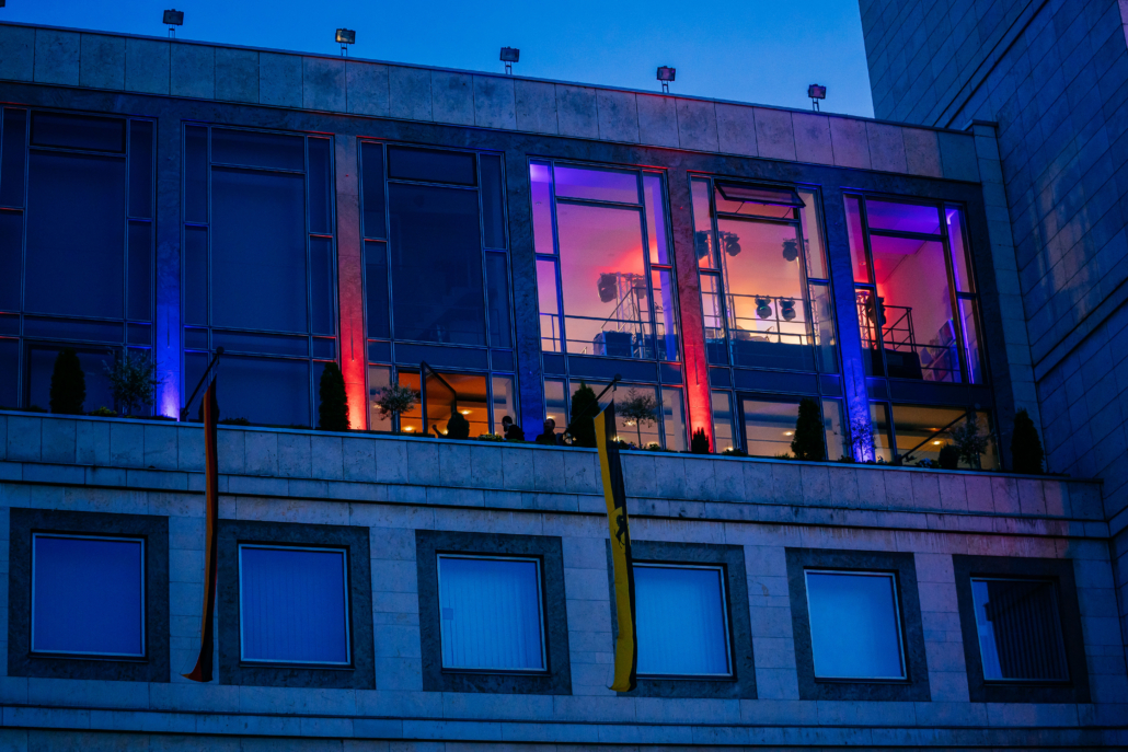 Ein wechselndes Programm auf zwei Bühnen und drei Ebenen mit unterschiedlichen Setups für diverse Unterhaltungs-Acts, Ansprachen und vieles mehr, dazu die Illumination des Rathaus Stuttgart von innen und außen – das waren die Anforderungen an uns für die „Lange Nacht der Museen 2022”. Sieben Techniker waren drei Tage lang für Aufbau, Showbetreuung und Abbau im Einsatz. Dabei musste am Aufbautag der Betrieb im Rathaus reibungslos weiterlaufen. Auch die Planung der Logistik im Rathaus war etwas anspruchsvoll, da die Hauptbühne im 4. Obergeschoss nur über zwei kleine Personenaufzüge beliefert werden konnte.